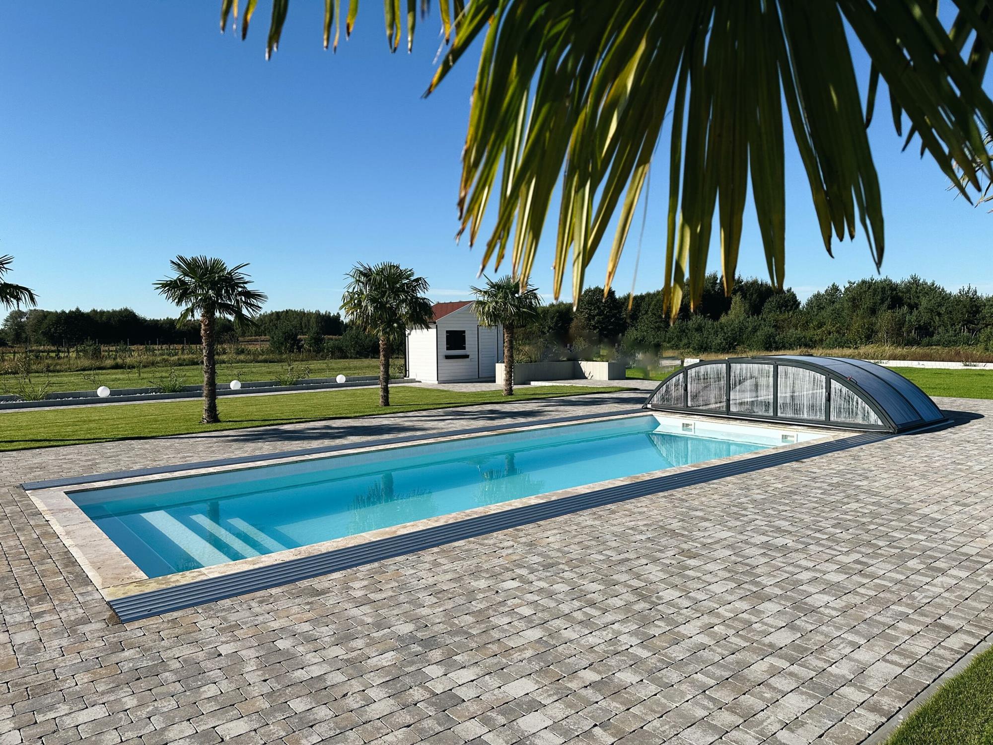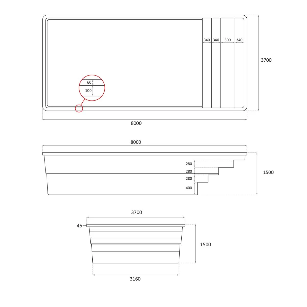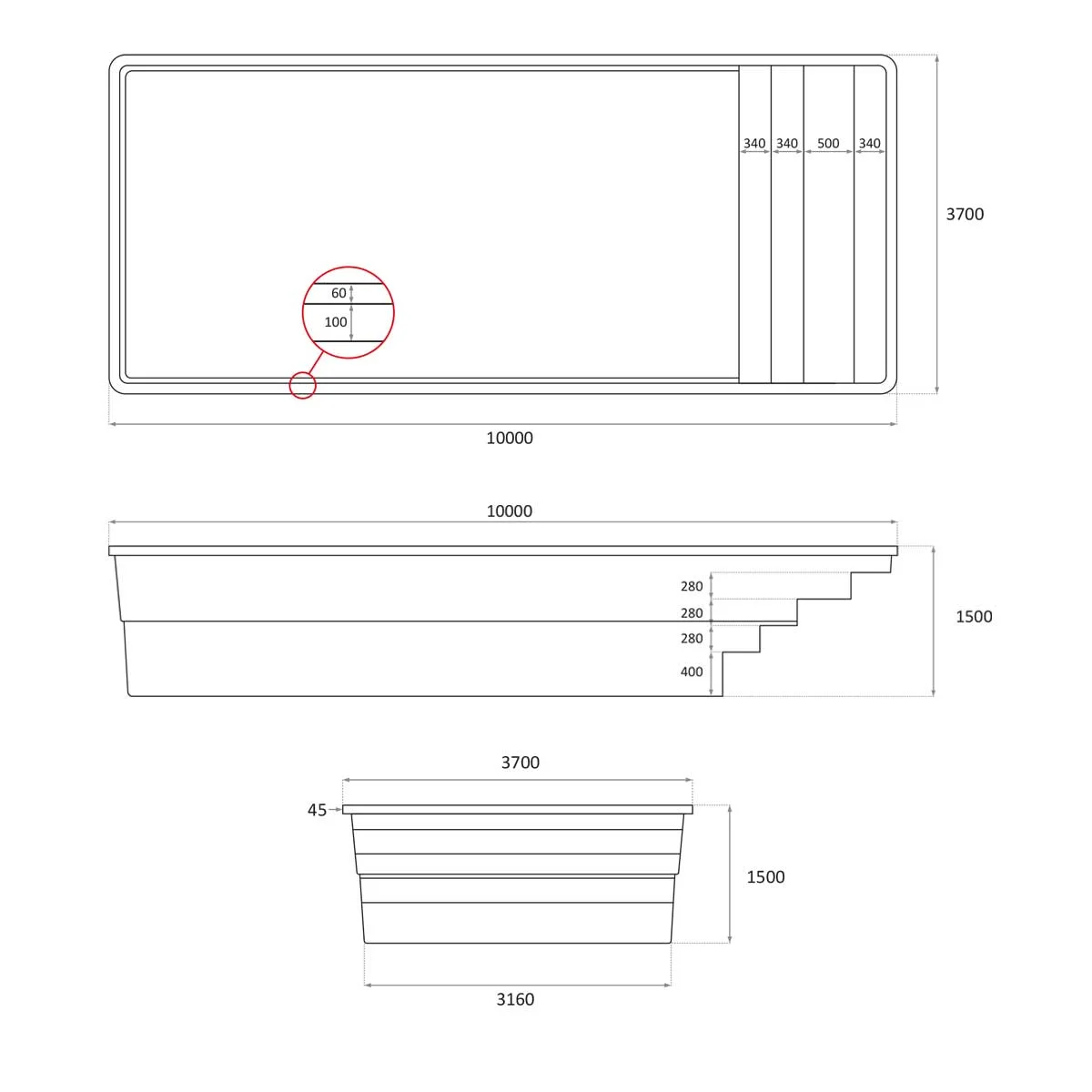 Dank seiner großzügigen, jedoch auch minimalistischen Form, die den aktuellen Trends entspricht, hat sich unser Gartenpool-Modell schnell zu einem Bestseller entwickelt. Die Form dieses rechteckigen Pools wurde für maximalen Komfort konzipiert – sowohl für diejenigen, die sich aktiv im Wasser aufhalten, als auch für diejenigen, die lieber auf den großzügigen Stufen entspannen.